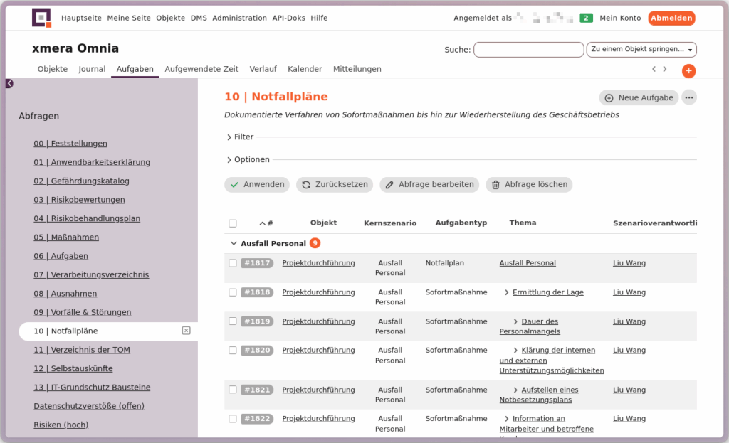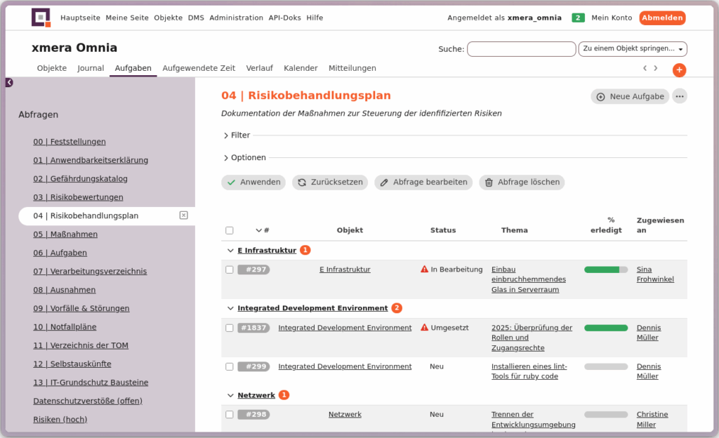 Beschreibbare Abfragen für selbsterklärende Filter: Individuell erstellte Abfragen (z. B. zu offenen Risikobehandlungsmaßnahmen) können jetzt mit einer eigenen Beschreibung versehen werden.