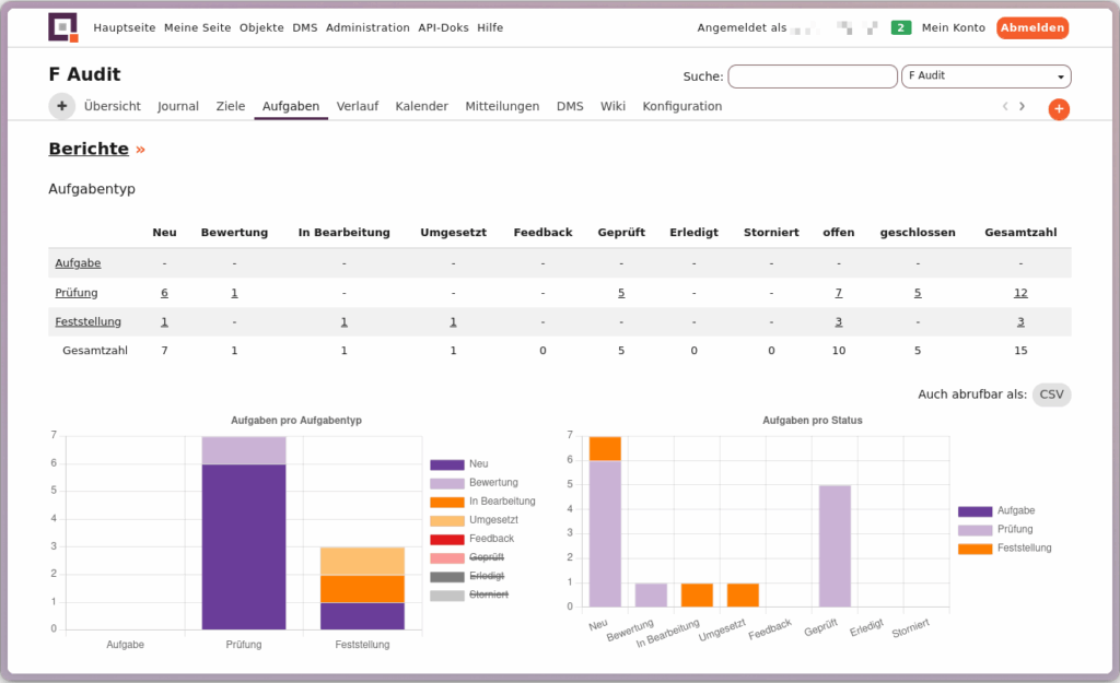 Tabellarische und grafische Berichte zeigen Prüfergebnisse jetzt noch aussagekräftiger: Tabellen lassen sich als CSV exportieren und enthalten eine abschließende Summenzeile und -spalte, die etwa die Gesamtzahl der Audits oder Feststellungen sowie zusammgefasste Statuskennzahlen ausweist.
