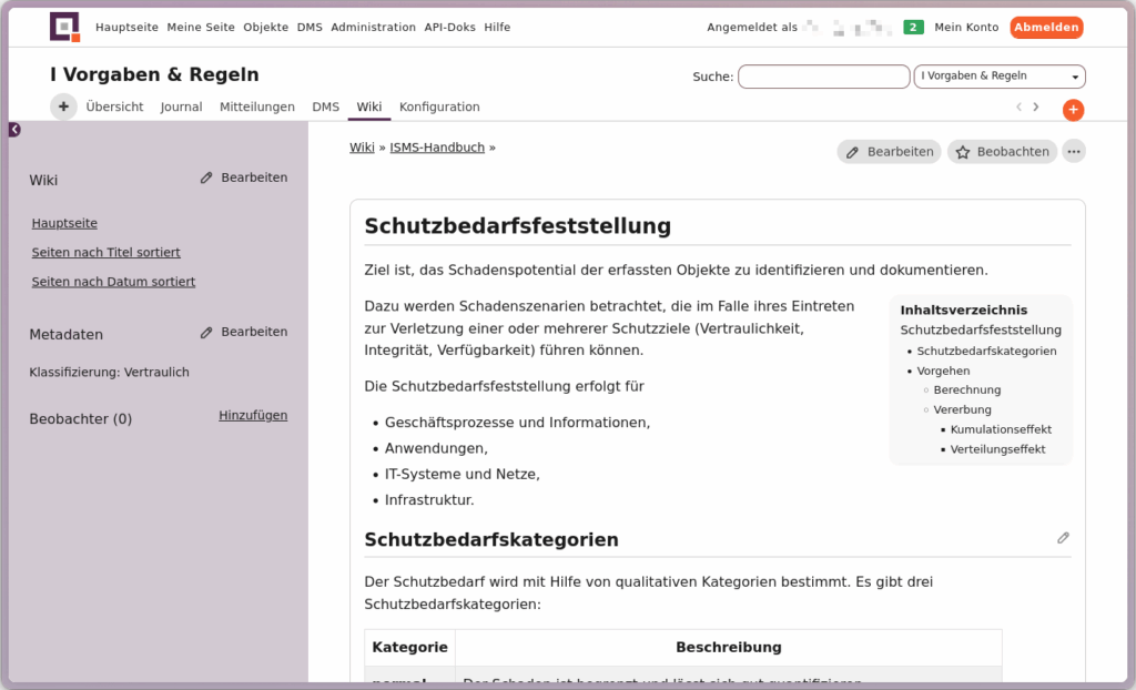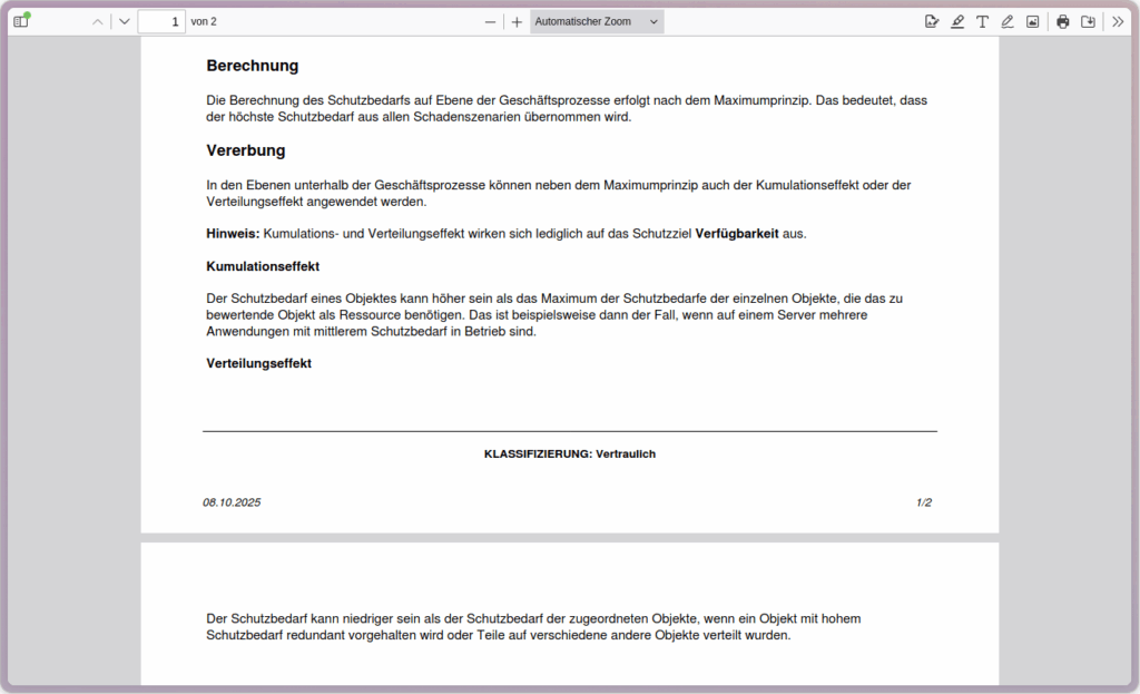 Diese Metadaten werden beim PDF‑Export einer Wiki‑Seite oder eines gesamten Wikis im Fußbereich ausgegeben, sodass wichtige Kontexte (z. B. Klassifizierung, Verantwortliche, Versionshinweise) direkt mitgeliefert werden.